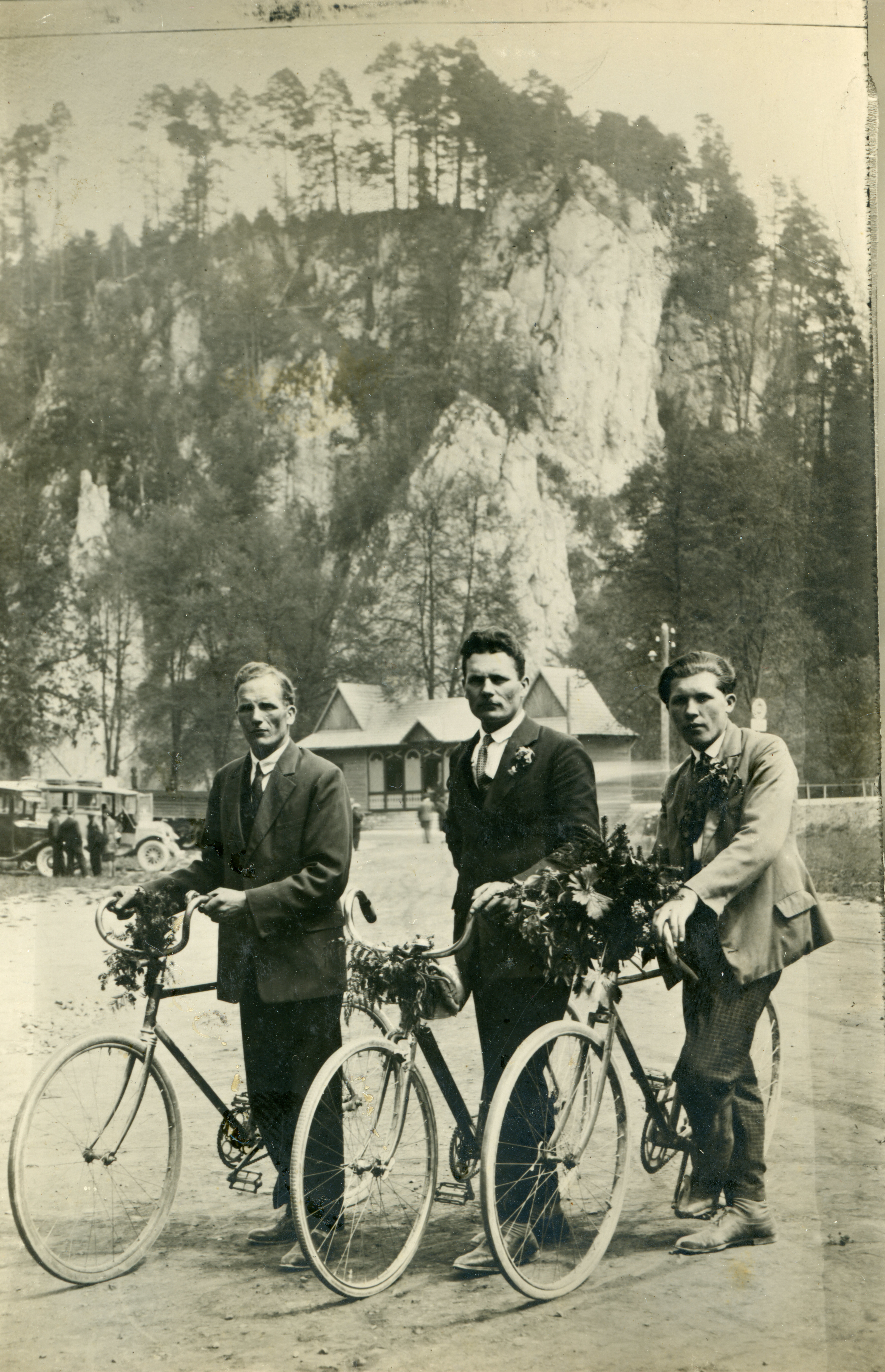 Wycieczka rowerowa do Ojcowa. Bracia Stanisław i Ignacy Kudasowie, oraz nierozpoznany mężczyzna.